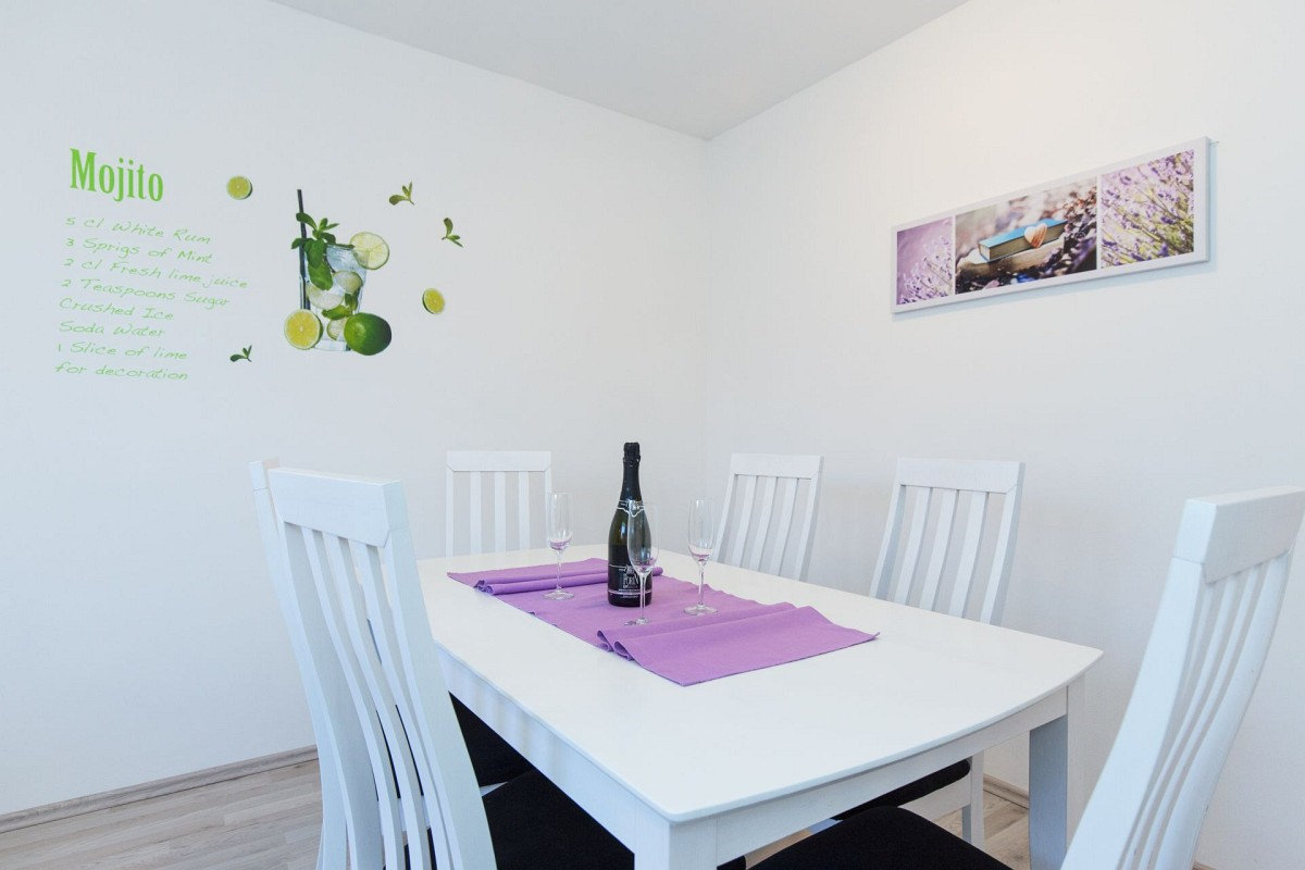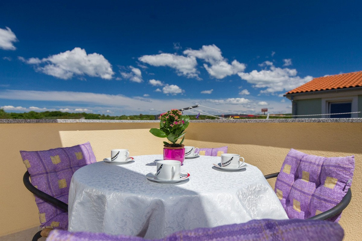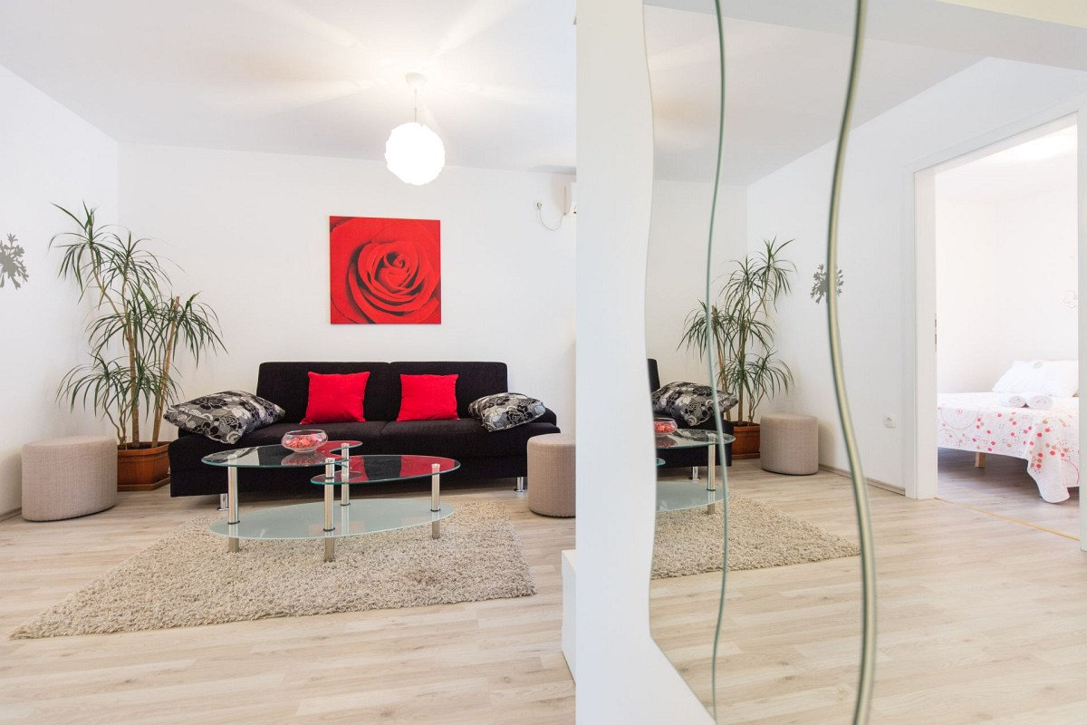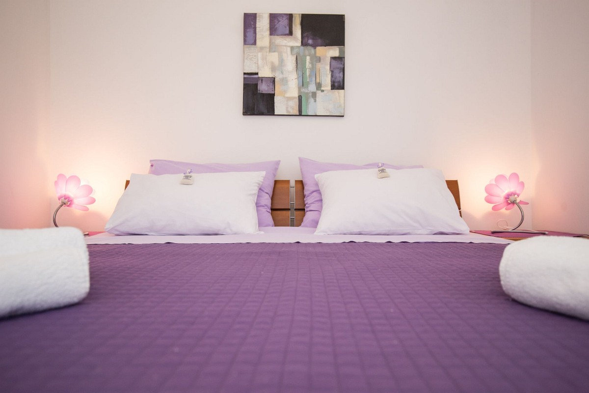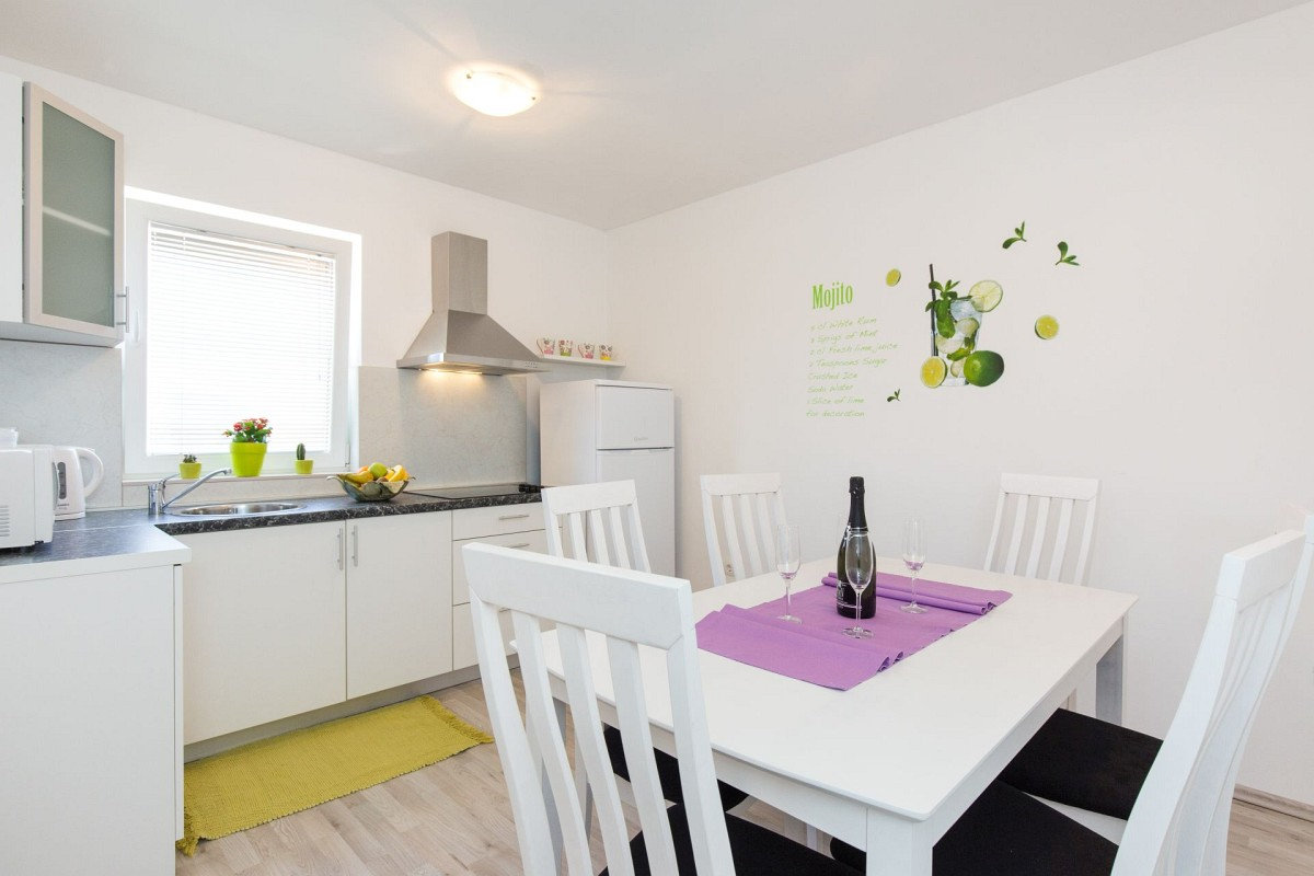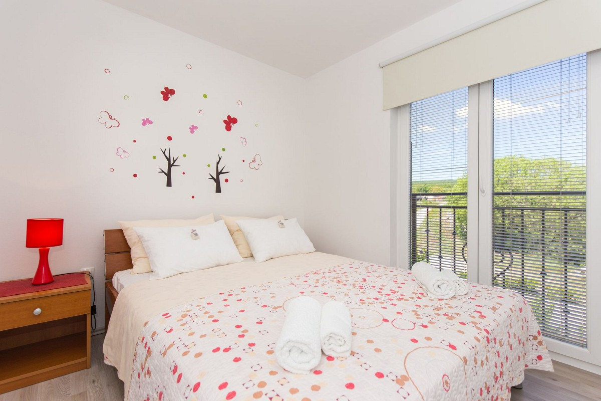 Ovaj moderan i lijepo uređen apartman nalazi se na drugom katu obiteljske kuće. U svojih 50 m2 apartman može ugostiti 4 do 5 osoba, a sastoji se od kuhinje i dnevnog boravka, dvije spavaće sobe s bračnim krevetima, kupaonice s tuš kabinom, i balkona.