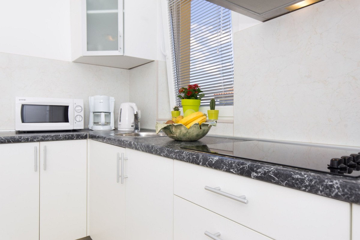 Perilica suđa, Štednjak na struju, Hladnjak sa zamrzivačem, Filter aparat za kavu, Kuhalo za vodu, Stol za jelo i sjedalice za sve osobe, Mikrovalna pećnica, Roštilj